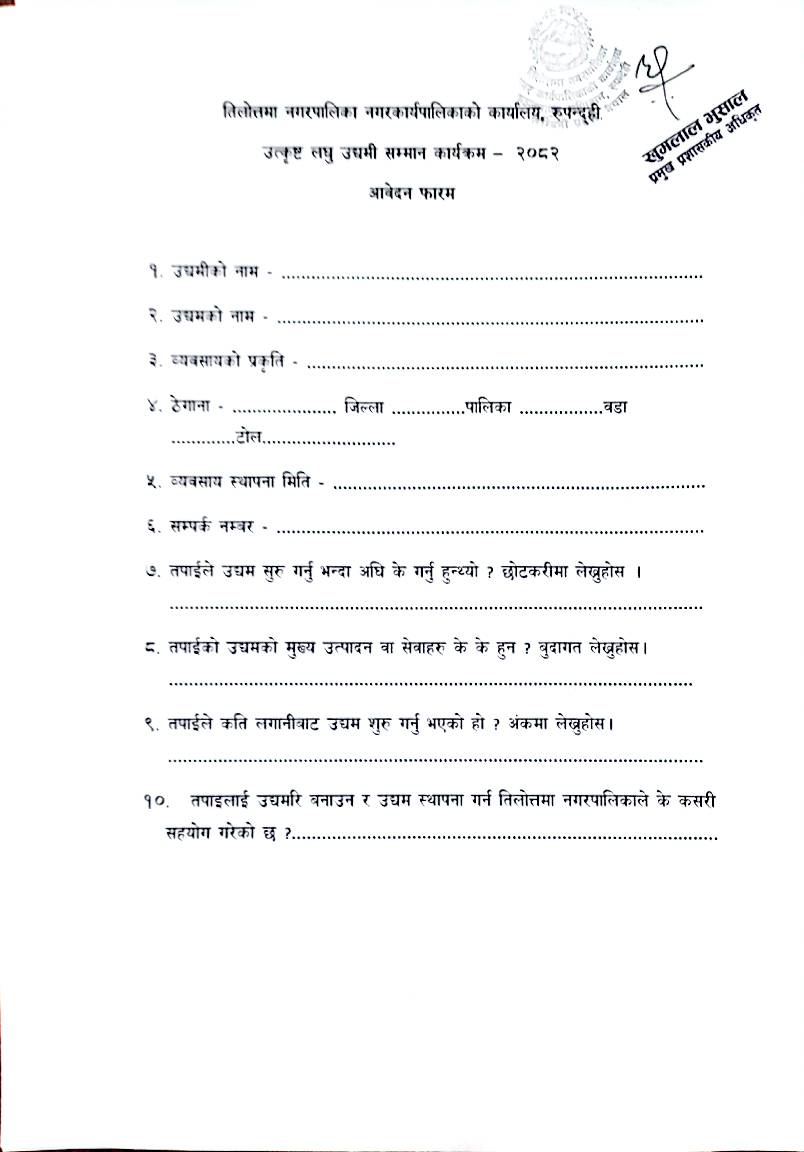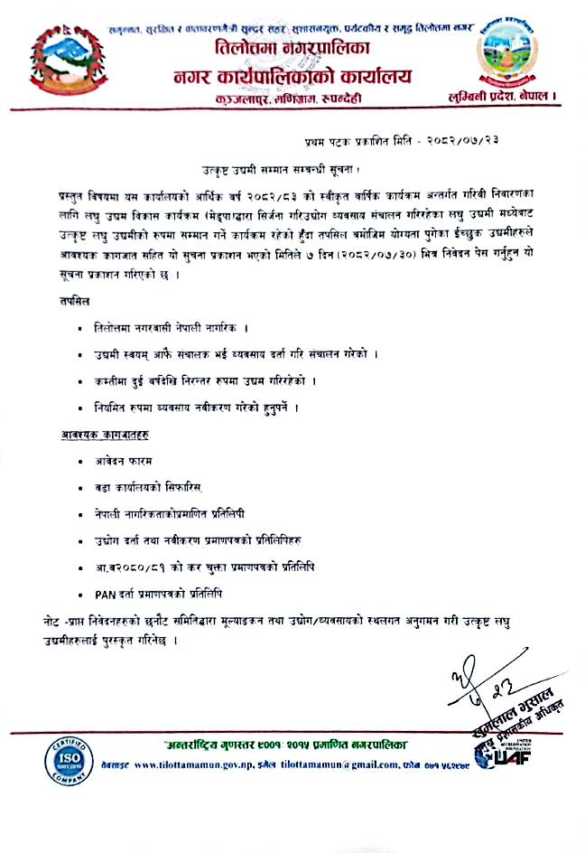 उत्कृस्ट उद्यमी सम्मान सम्बन्धि सुचना।